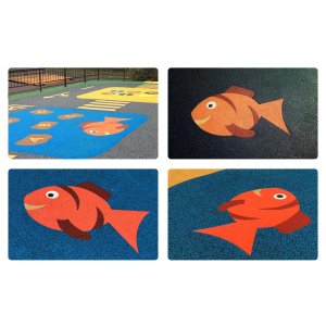 När man skapar ett fallunderlag i gummi på lekplatsen kan man mot en liten extra kostnad integrera 2D-element. Figurerna gjuts ned i gummibeläggningen tillsammans med det översta lagret av gummi och blir därmed en del av den totala ytan. På så vis skapas en spännande yta som inspirerar fantasin och ger stor lekvärde för barnen under många år framöver.
