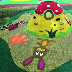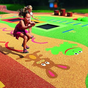 När man skapar ett fallunderlag i gummi på lekplatsen kan du få inbyggda 2D-element mot en liten extra kostnad. Figurerna gjuts in i fallunderlaget tillsammans med det översta lagret av gummi och blir på så sätt en del av den totala ytan.