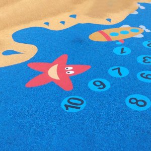 När man skapar ett fallunderlag i gummi på lekplatsen kan du få inbyggda 2D-element mot en liten extra kostnad. Figurerna gjuts in i fallunderlaget tillsammans med det översta lagret av gummi och blir på så sätt en del av den totala ytan.