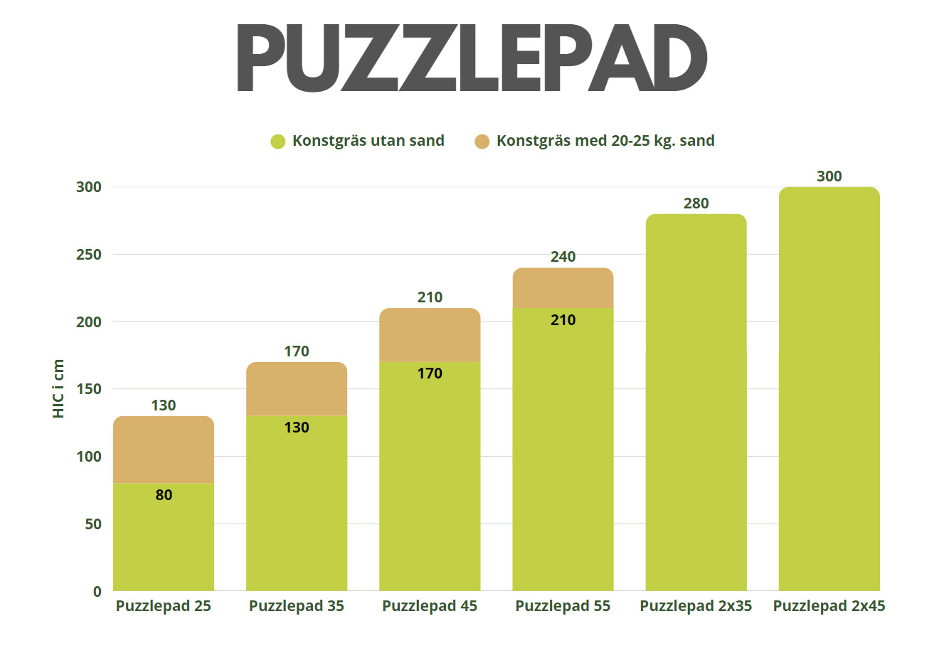 Våra 45 mm tjocka puzzlepads är godkända till fallhöjder upp till 2,1 meter. Installationen går snabbt och enkelt tack vare pusselsystemet. Puzzlepaden är tillverkad av återvunnet material och har en lång livslängd. Bra dräneringsegenskaper säkerställer att konstgräset snabbt blir användbart, även efter kraftiga regnskurar.